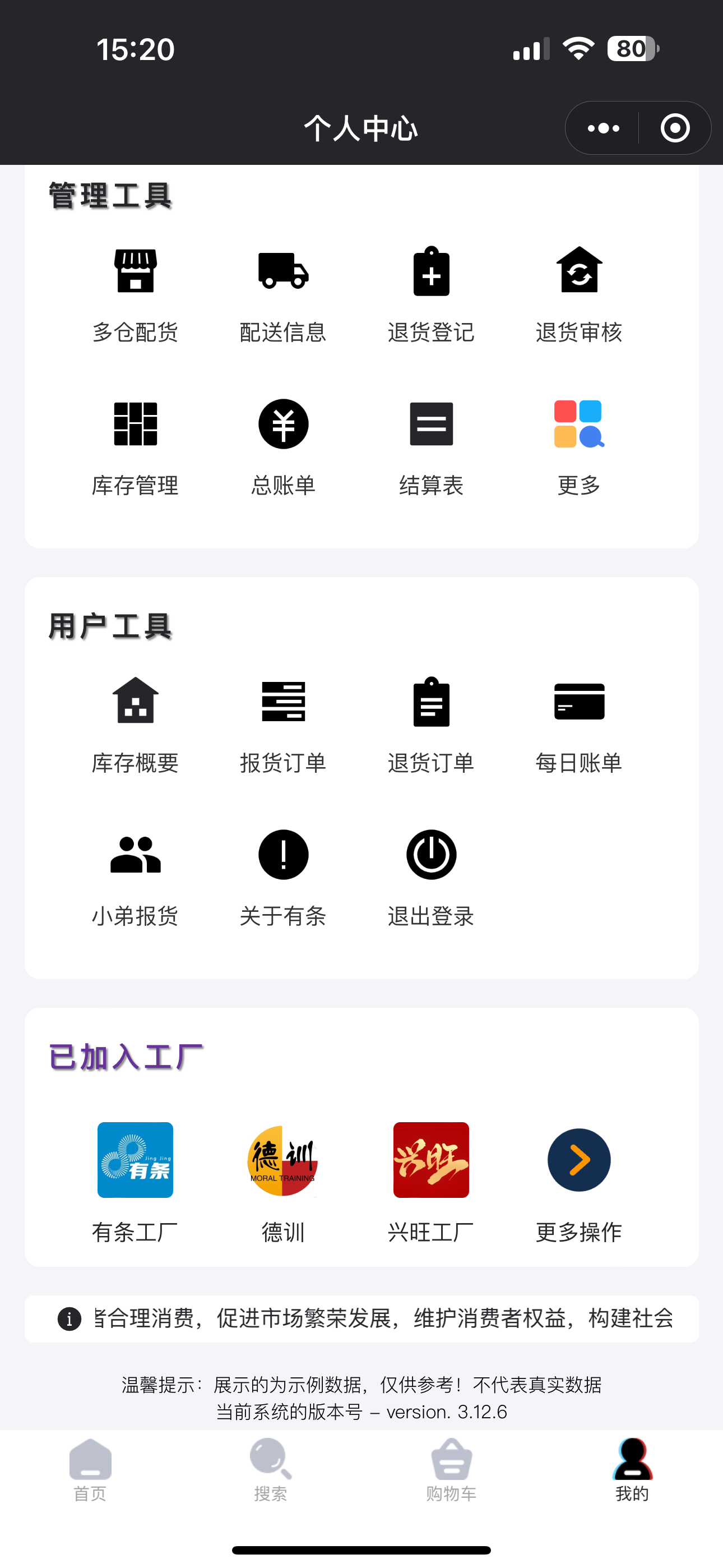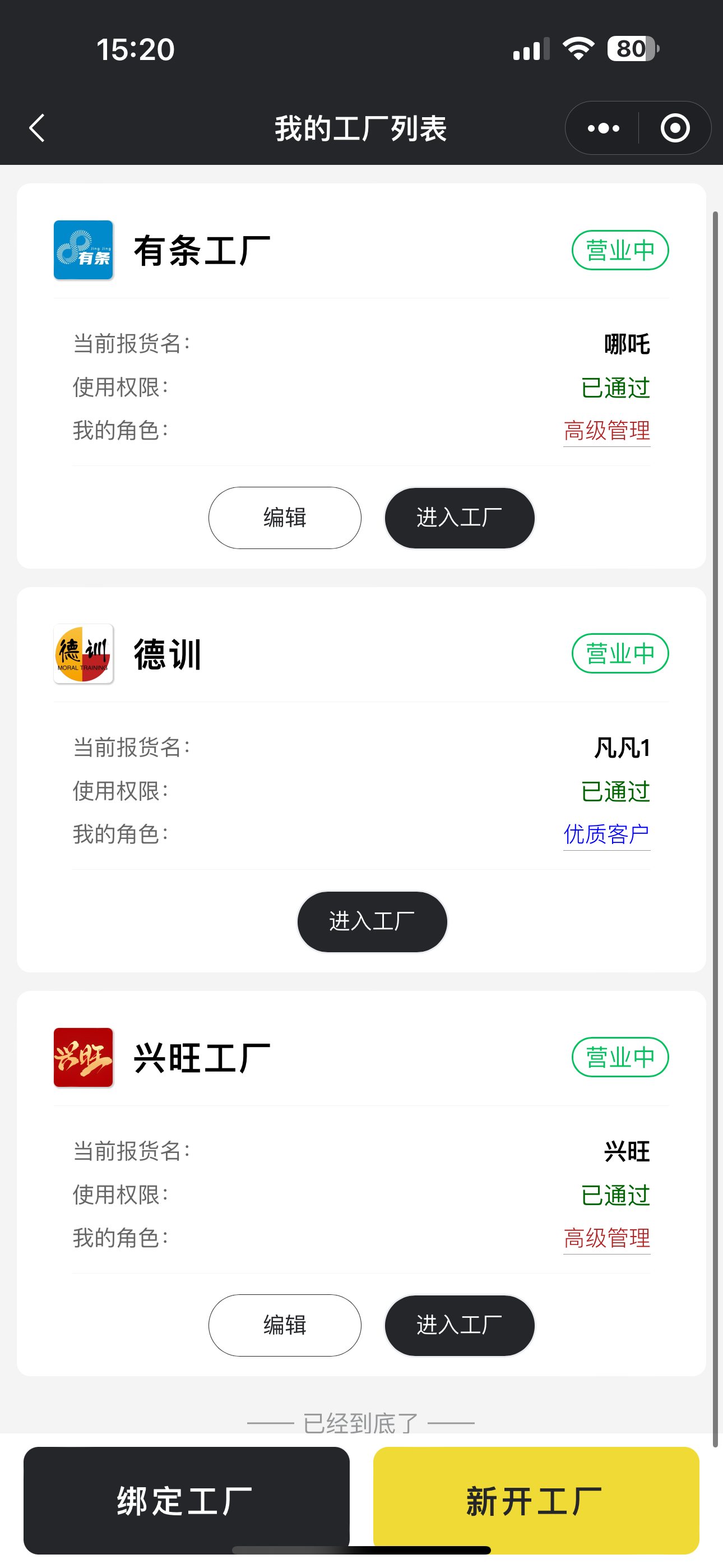 示例仓库、示例分类、示例商品、示例商品尺码用户可以在 【 已加入工厂 - 更多操作】 中查看已添加的工厂列表,并找到新增的“兴旺工厂”。 点击工厂名称即可进入并开始管理全新的工厂。