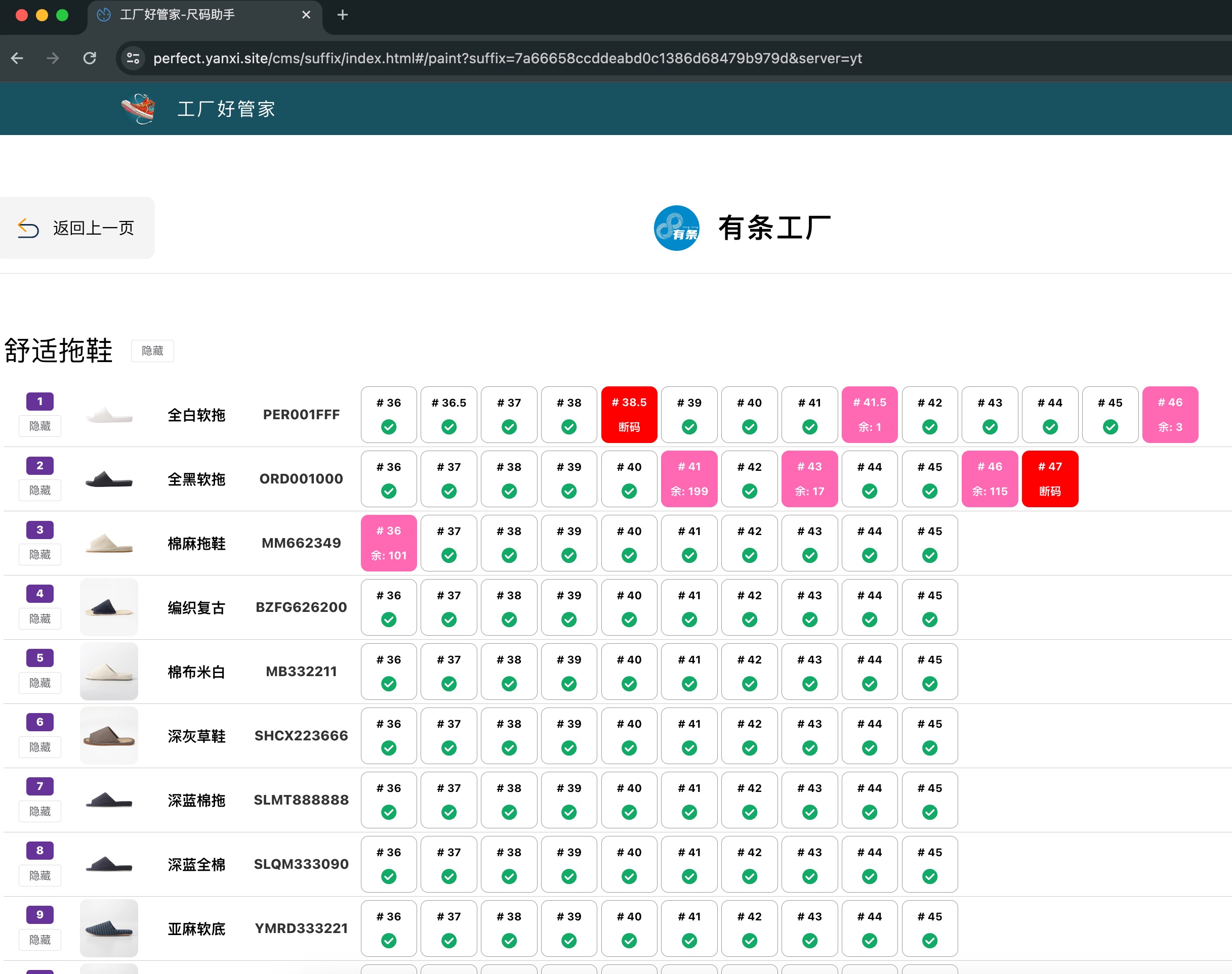 - 库存尺码图:仅展示尺码数量少于警戒线以及断码的商品。充足库存的商品将用 ✅ 标记代替