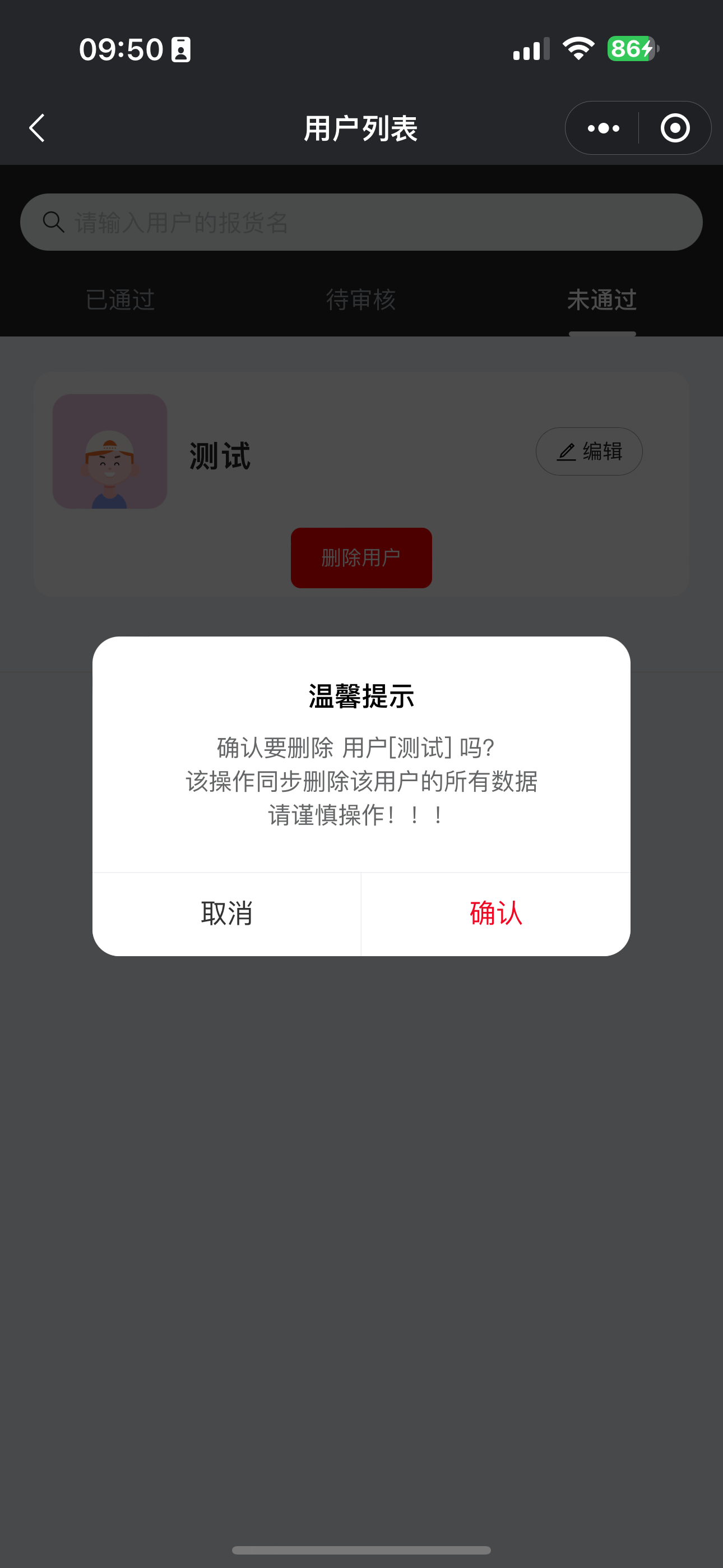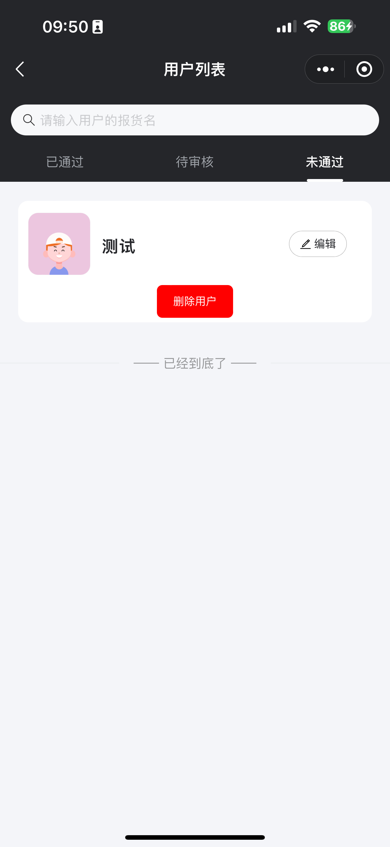 用户在被禁用之后,我们在用户列表中点击未通过的列表!然后可以看到所有被禁用的用户!找到我们想删除的用户,点击删除即可、如果想要删除用户,那么一定要先禁用该用户!