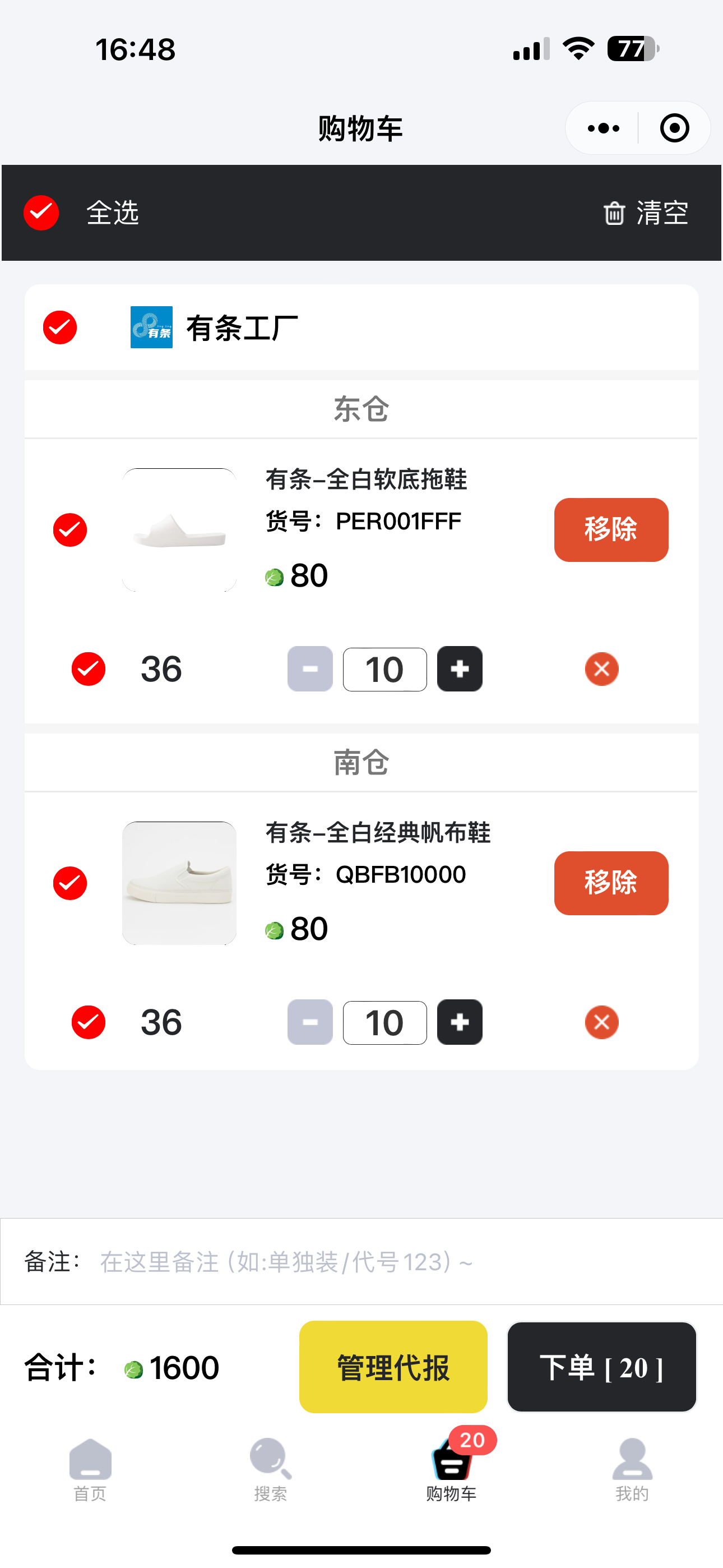 图中的全白软底 和 帆布鞋 存放在两个仓库中,这边会自动根据仓库拆分成两个独立的订单