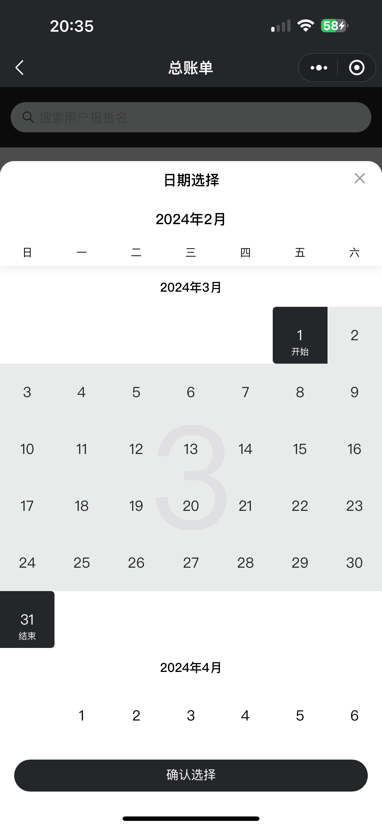 除了上述的功能以外,好管家账单还支持统计 月账单,周账单等!这个 日期区间可以自定义 的。然后选择想要被统计的客户!系统会自动累计出该客户在指定时间内的所有账单信息。