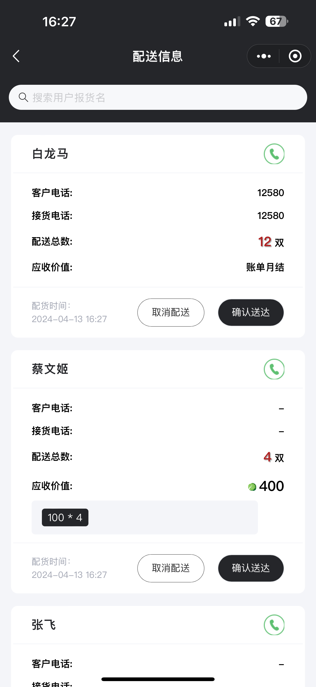 配送列表的操作通常都是在货物送达与否之后操作!配送完成会 “ 自动生成当日 账单!!” 多笔配送会按日期/用户名自动 “ 合并 ” 到该用户的当日账单中。