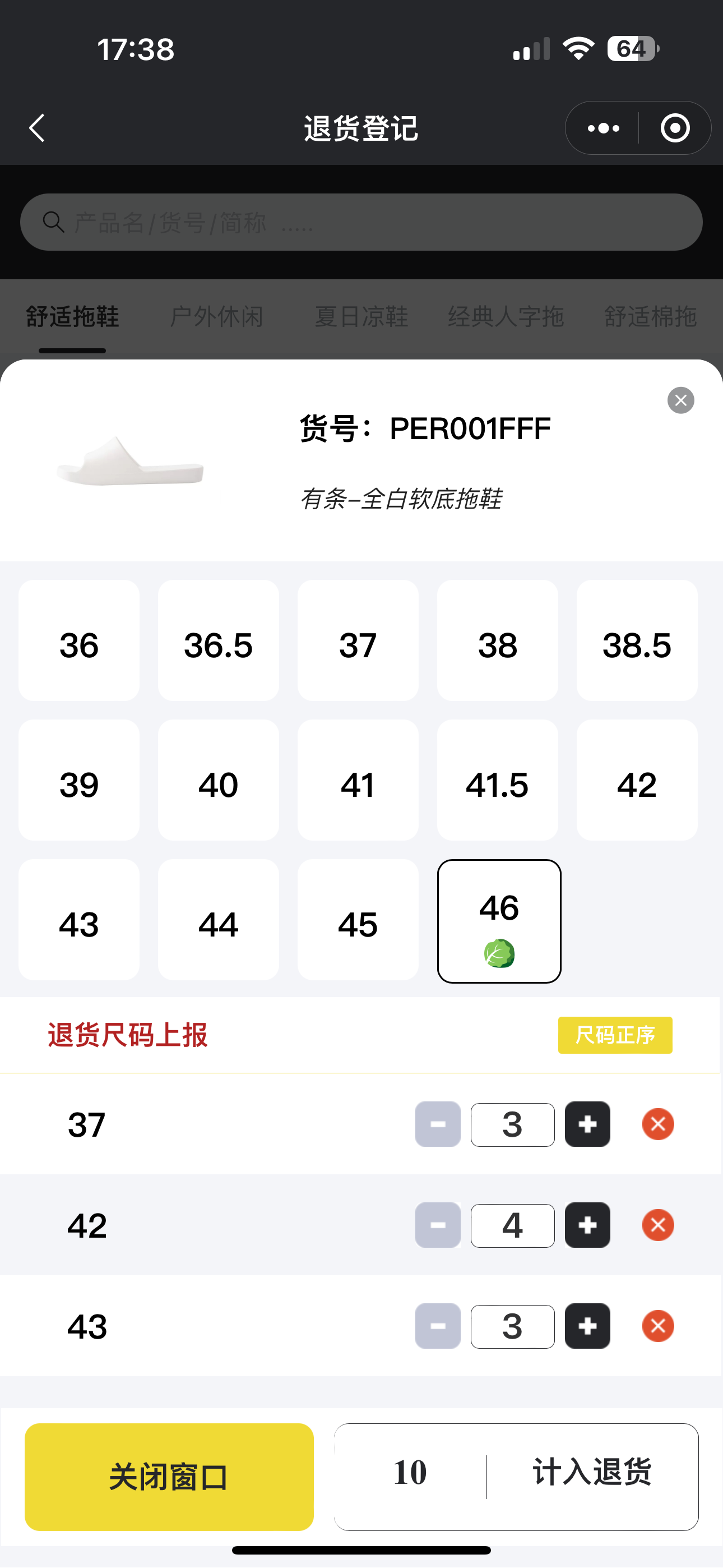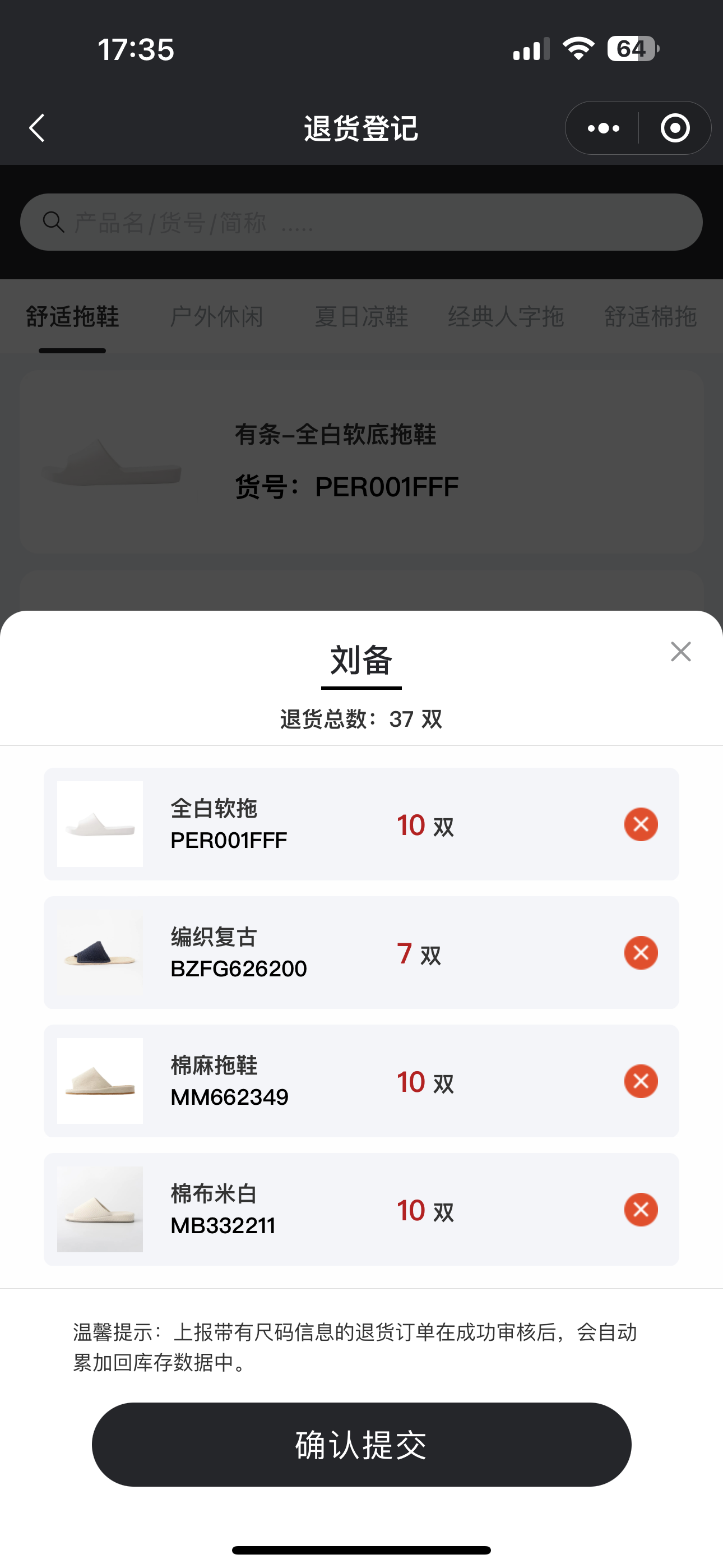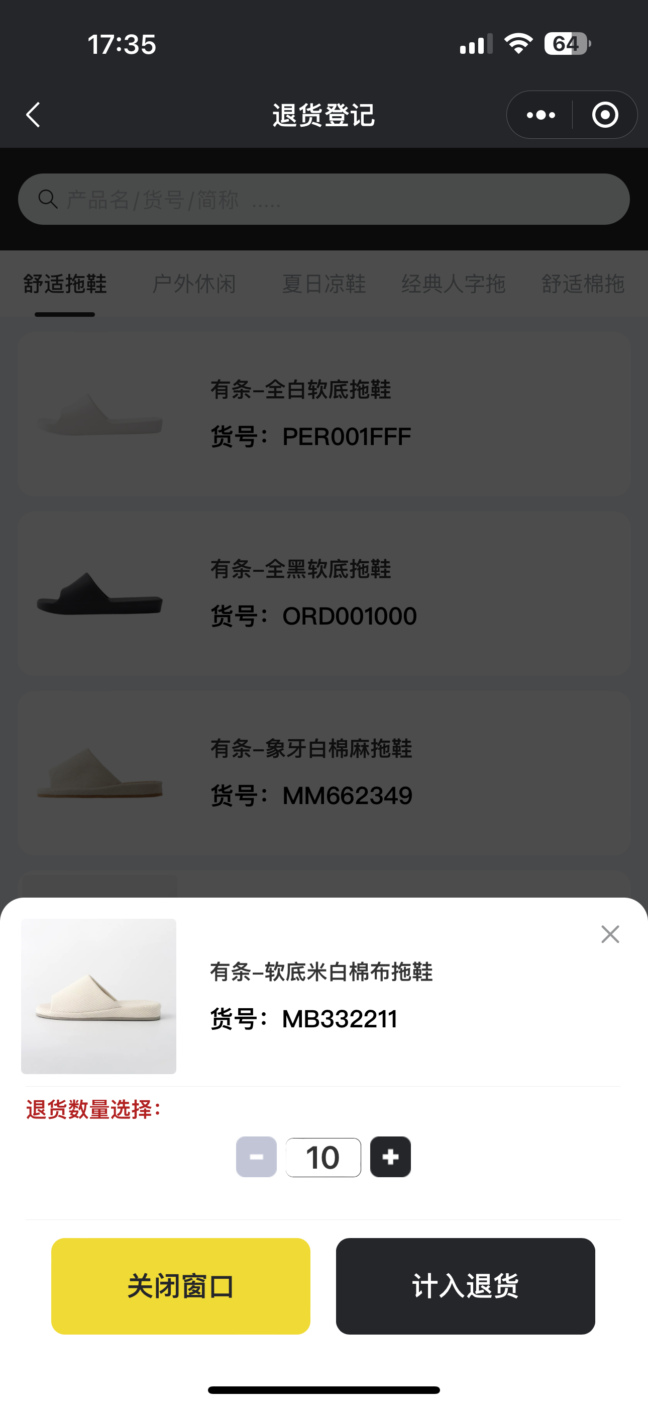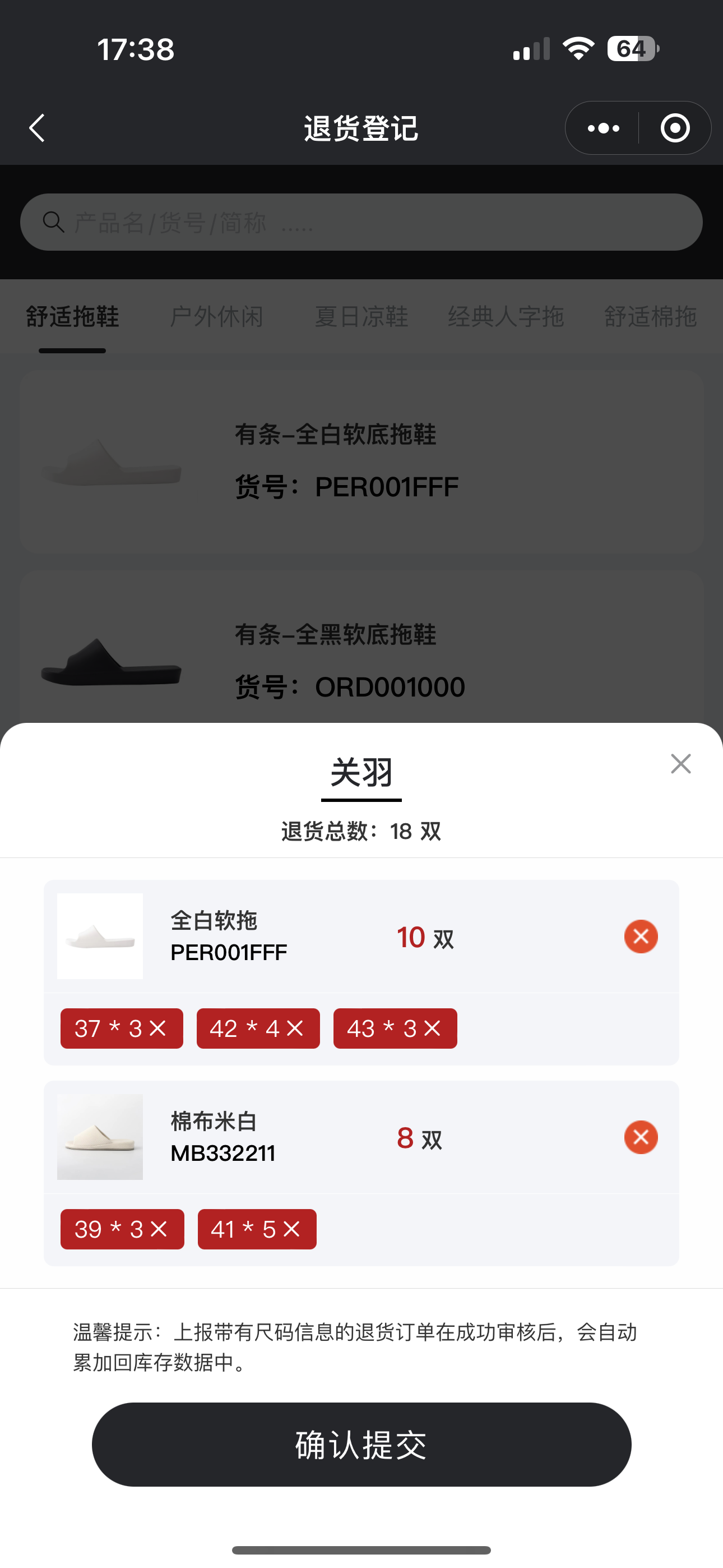 该模式下上报就会变的比较简单,上报的人员 只需要选择商品的数量 ,然后直接提交即可!这边 “ 无需提交具体尺码和对应的数量 ” 。那么在这里我们可以看到是把步骤简化了~ 同样该方式在提交到高级管理审核之后我们会自动 “ 合并到当日的账单中! ” 但是这里由于没有具体的尺码数据,仅只能做到账单功能,没有办法对库存的内容进行更新!那么这就需要后续在退货重新入库的时候,使用我们的 【 库存管理 】 重新入库!