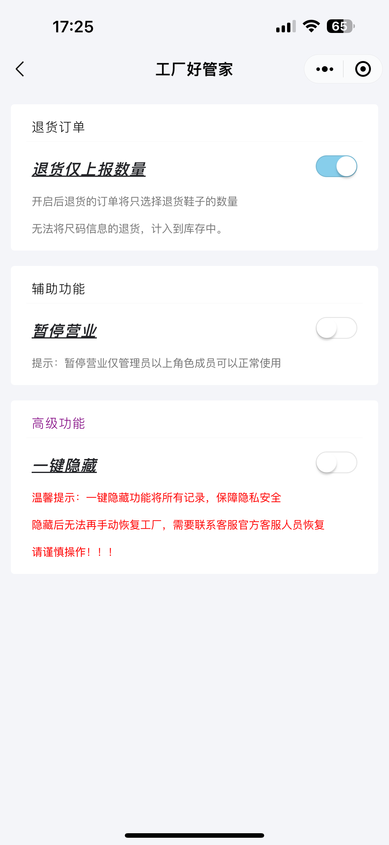 【我的】-【管理工具】-【更多工具】-【工厂设置】- 【退货仅上报数量】