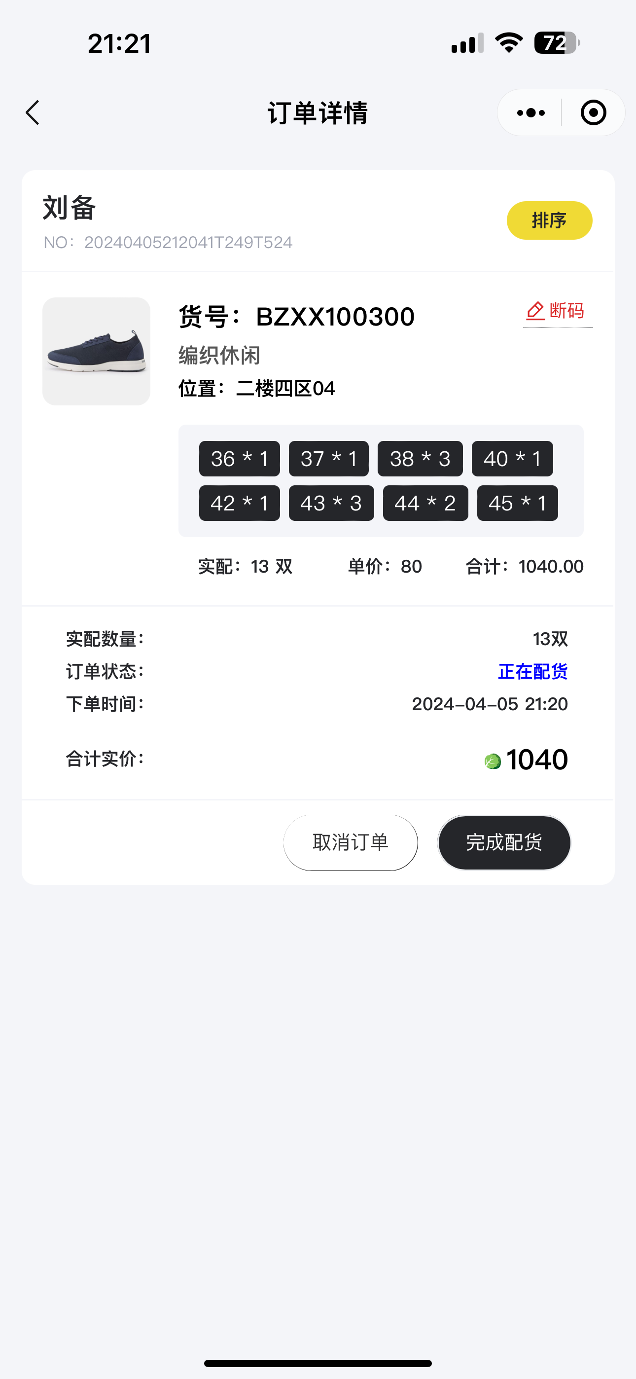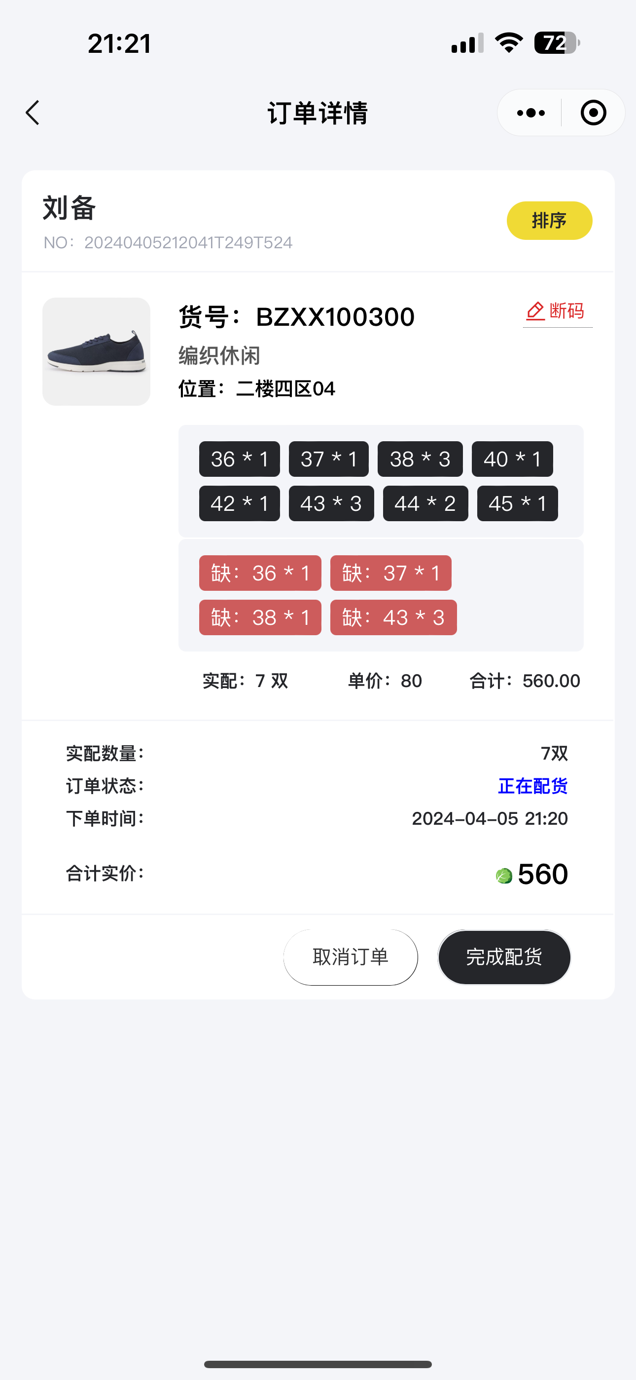 假设出现鞋子断码的情况,比如 36 码、37 码和 43 码都断码了,而 38 码只剩下两双,还差一双鞋来配给这个客户。我们的软件可以直接点击卡片上的断码信息,将断码情况上报,系统会立即计算出实际配货的数量等信息。 这样,配货员就能清晰了解到断码情况,并能够及时采取补货措施。