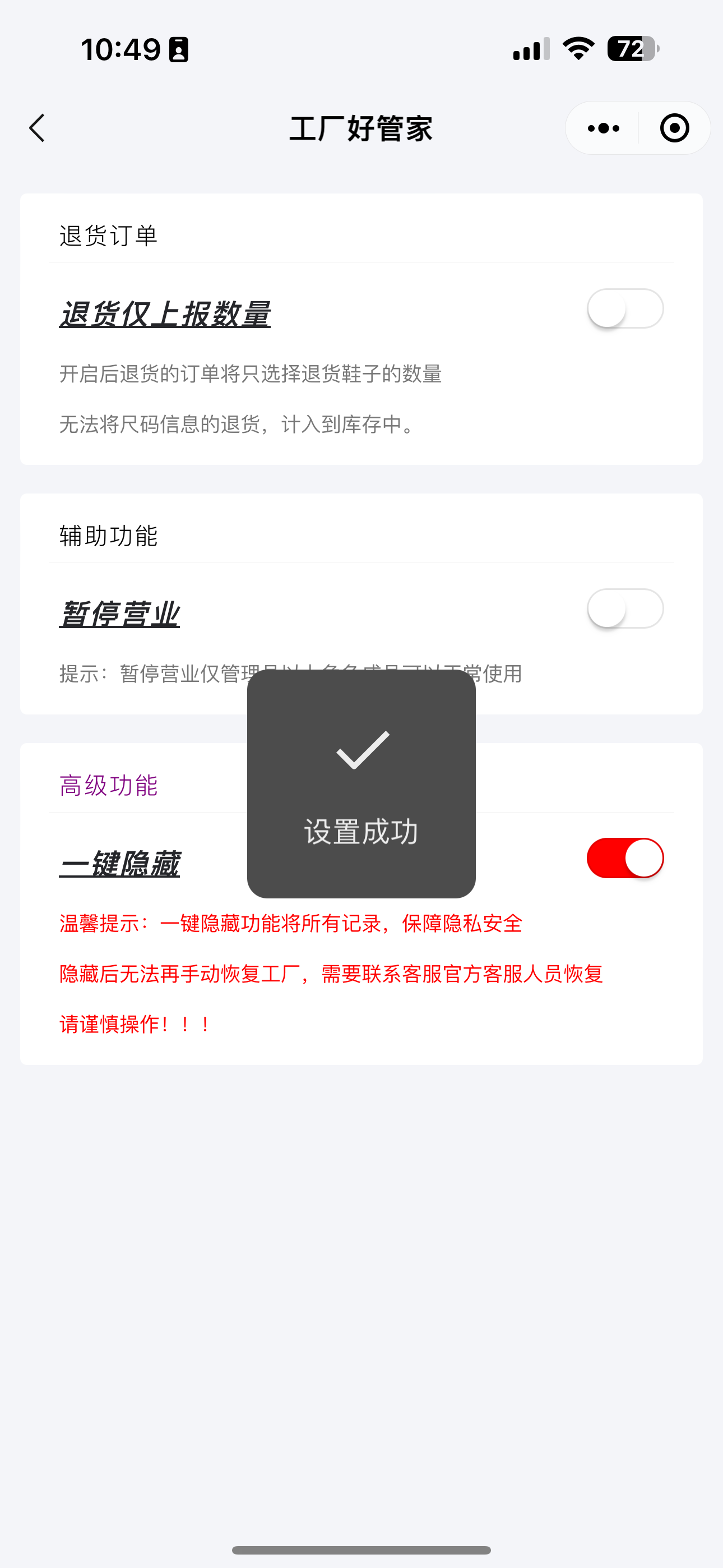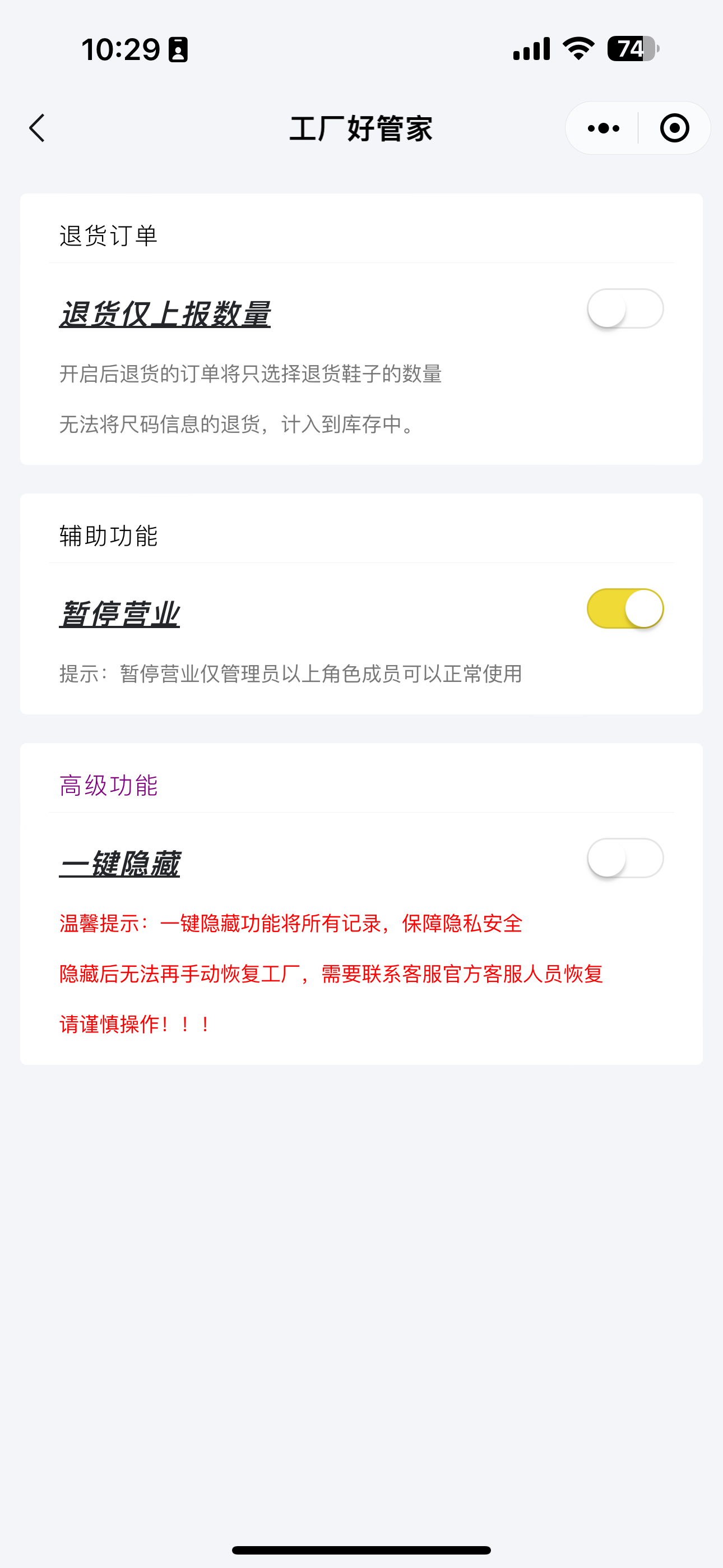 使用场景:假设工厂 晚上 7 点 截止接单! 可以开启 “暂停营业”