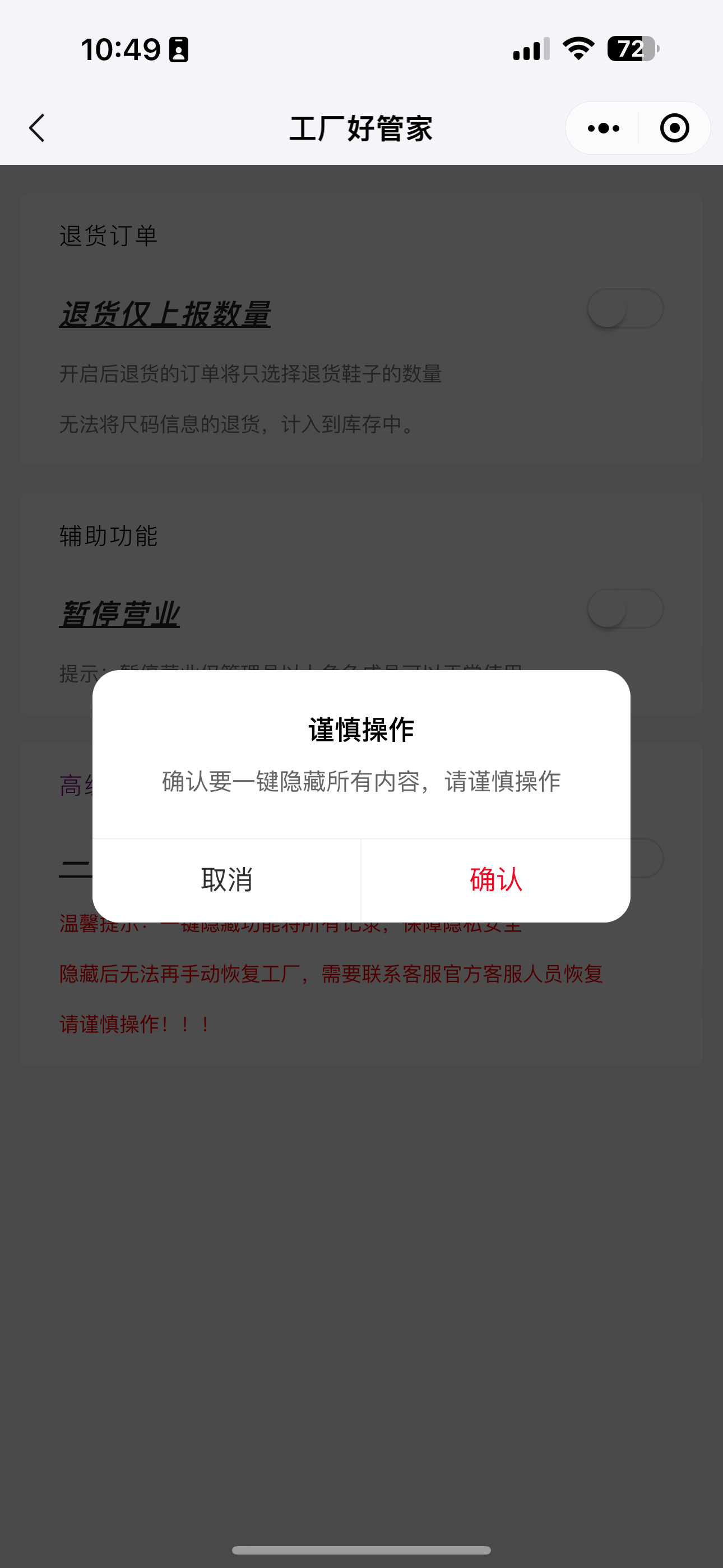 当一键隐藏功能被激活后,该工厂的 “ 所有人 ” ,无论身份角色如何,都将被限制访问工厂的功能。这是一种安全机制,用于在 紧急情况下或在进行系统维护时保护敏感数据和操作。