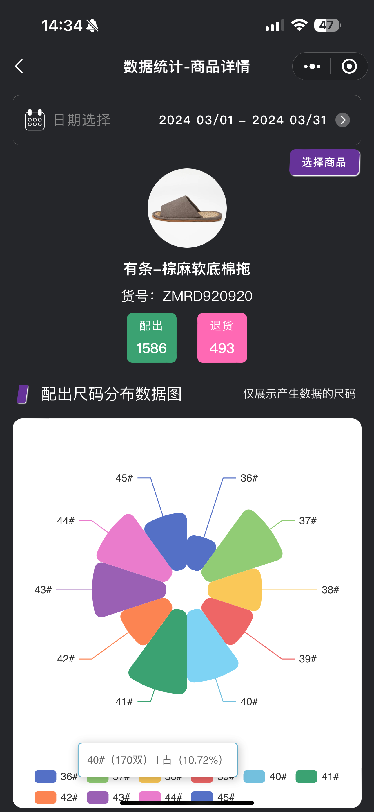 单款分析:对单一商品的深入分析可以揭示其销售表现和顾客偏好,为产品改进和个性化营销提供数据支持。 使用扇形图展示不同尺码商品的销售占比,可以直观地展示市场对不同尺码的需求,帮助商家进行针对性的产品规划和库存配置。